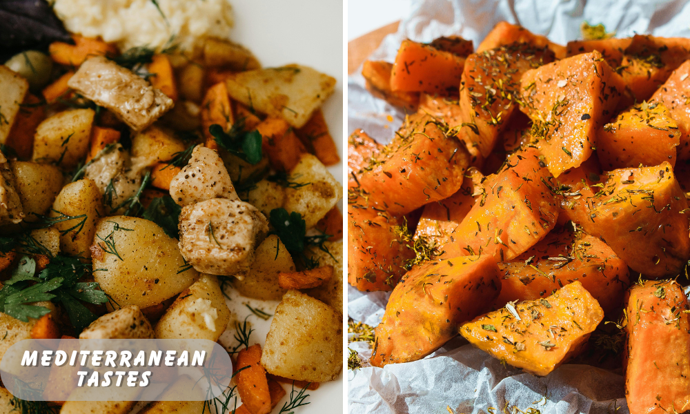 At my house, we usually eat these easy Mediterranean potatoes. They fit an equally simple Mediterranean meal on busy evenings. I often add roasted chicken, steak, or baked sides.