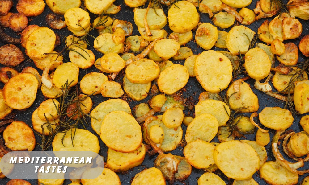 At my house, we usually eat these easy Mediterranean potatoes. They fit an equally simple Mediterranean meal on busy evenings. I often add roasted chicken, steak, or baked sides.
